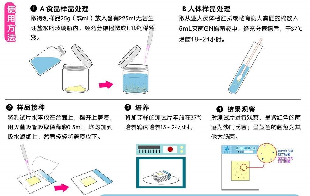 (2)本法還可應用於從業人員體檢、中樣品和物體(tǐ)表麵的檢測,用取樣棉簽塗抹被測物體表麵,放入裝有3mL滅菌生理鹽水的試管中,搖晃10s,然後取1mL接種到測試片上。